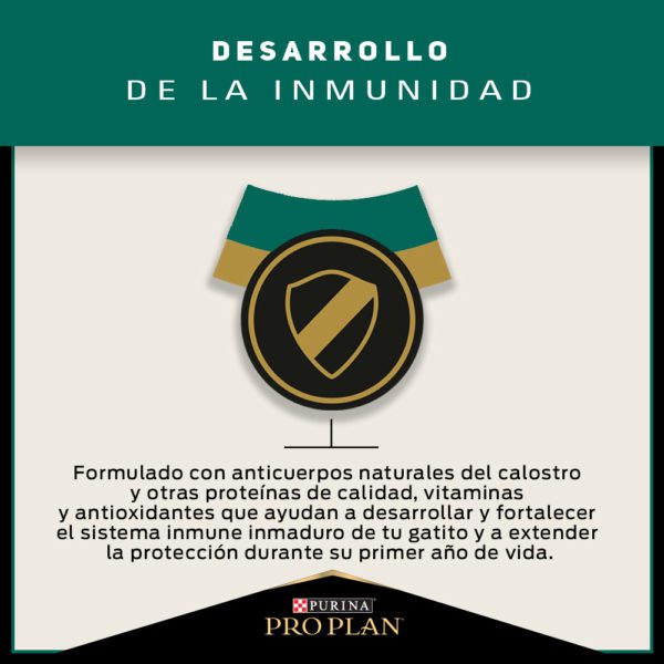 - Tecnología Optistart, contiene anticuerpos naturales del calostro y otras proteínas de calidad, vitaminas y antioxidantes que ayudan a desarrollar y fortalecer el sistema inmunológico inmaduro de tu gatito y a extender la protección durante su primer año formativo de vida.